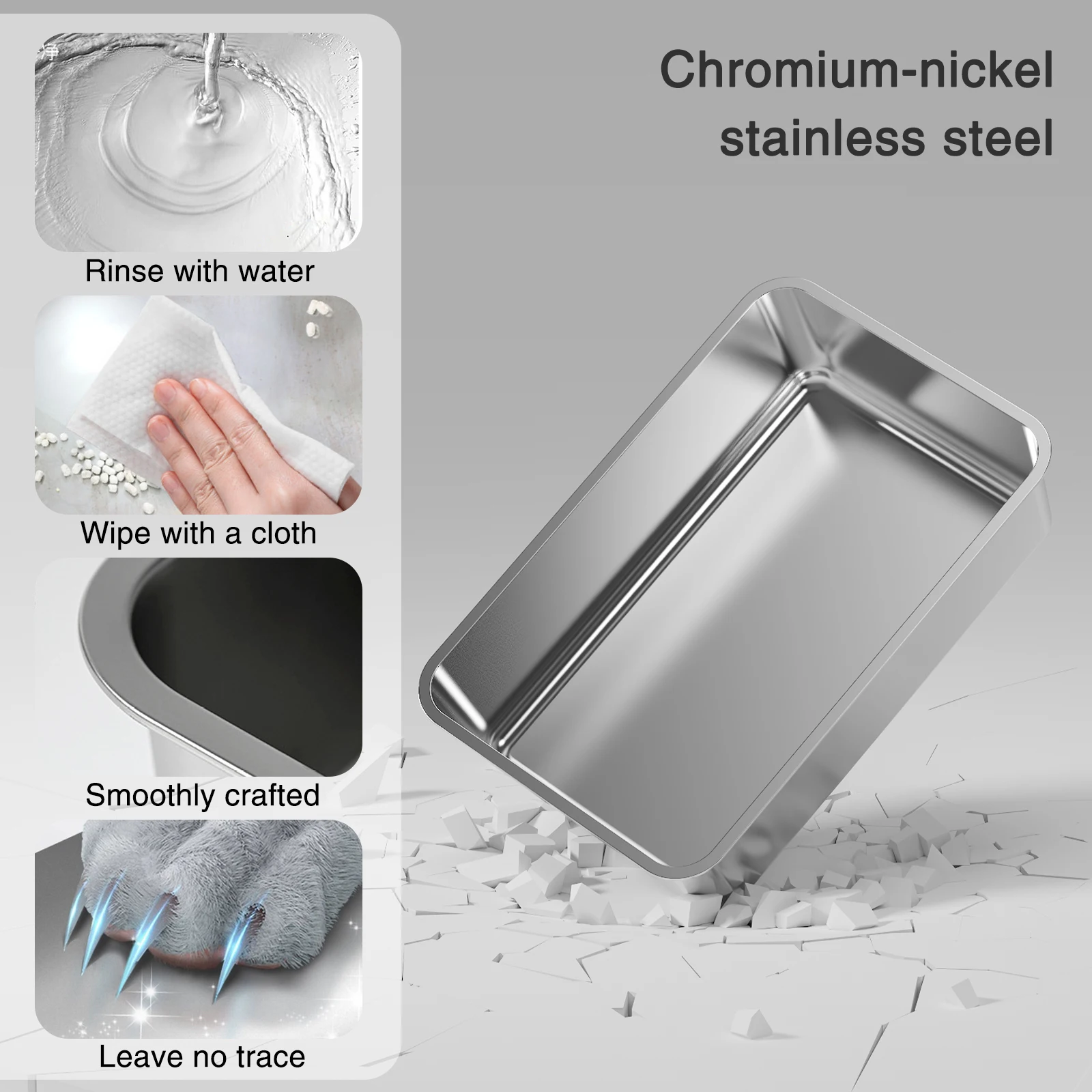 SUS304 Stainless Steel – Odor-Resistant & Easy to Maintain Unlike plastic alternatives, this metal litter box is made from durable SUS304 stainless steel, resisting rust, stains, and odors. Its non-porous surface ensures quick drying and easy rinsing—no scrubbing, soaking, or lingering smells. A long-lasting, hygienic kitty litter box solution that stays cleaner with less effort.
