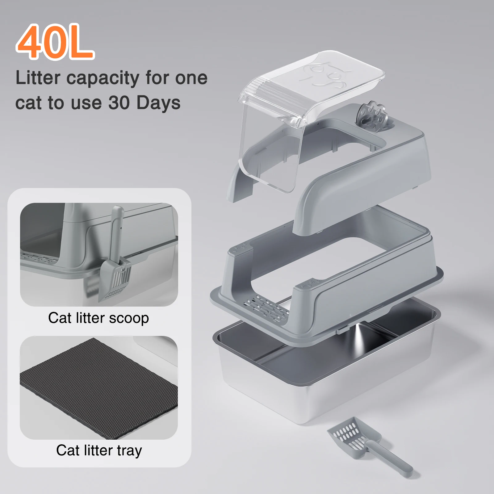 180° Fully Transparent Flip-Top Lid – Easy to Clean, Easy to See Tired of struggling with messy cleanups or bulky covers? This stainless steel litter box features a 180° fully transparent flip-top lid for effortless access and stress-free cleaning. Just press, lift, and scoop—no need to remove the entire cover. The crystal-clear lid lets you monitor your cat while maintaining their privacy. It's the perfect litter box with lid for pet parents who value convenience.