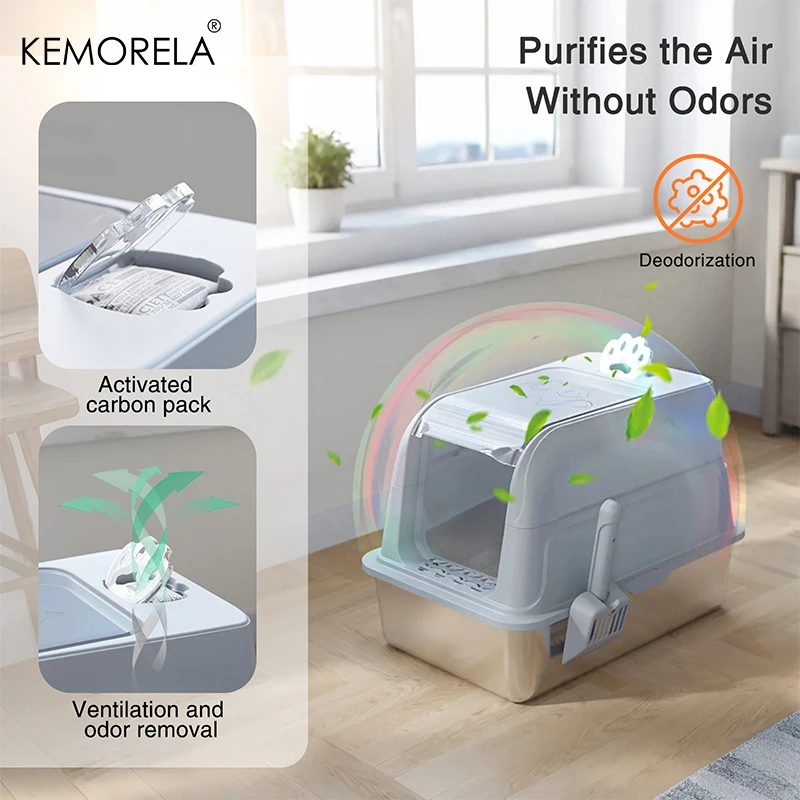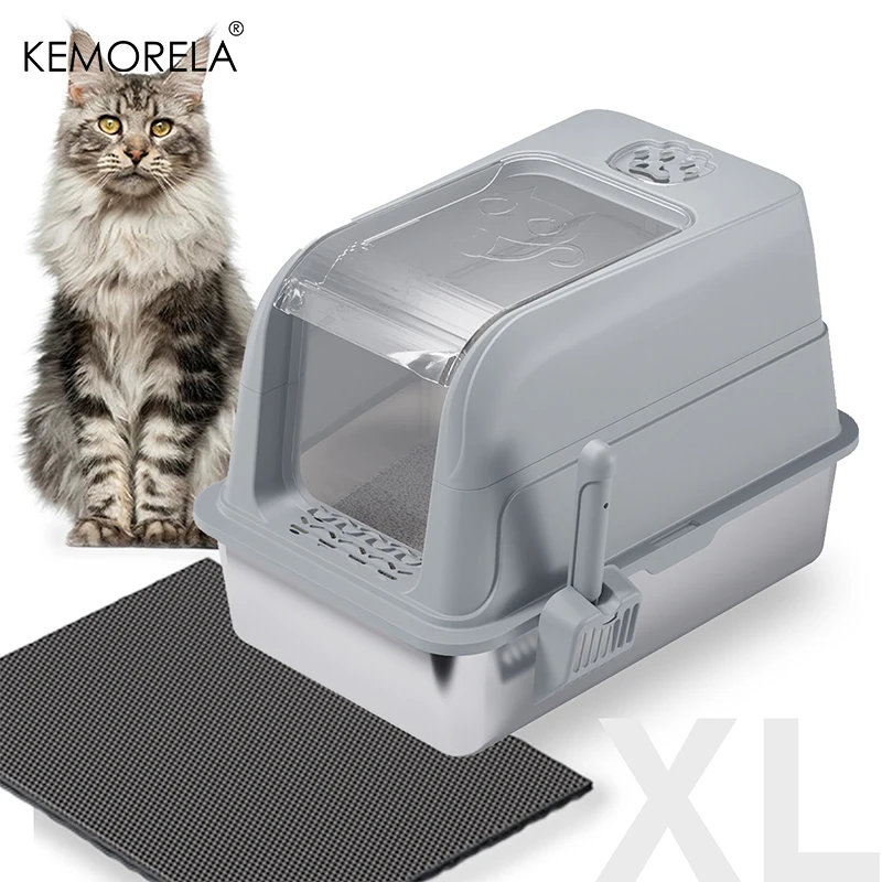 Enclosed Stainless Steel Cat Litter Box Cat Litter Box with Lid Mat & Scoop High-Sided Metal Kitty Leak-Proof Tray For Big Cats